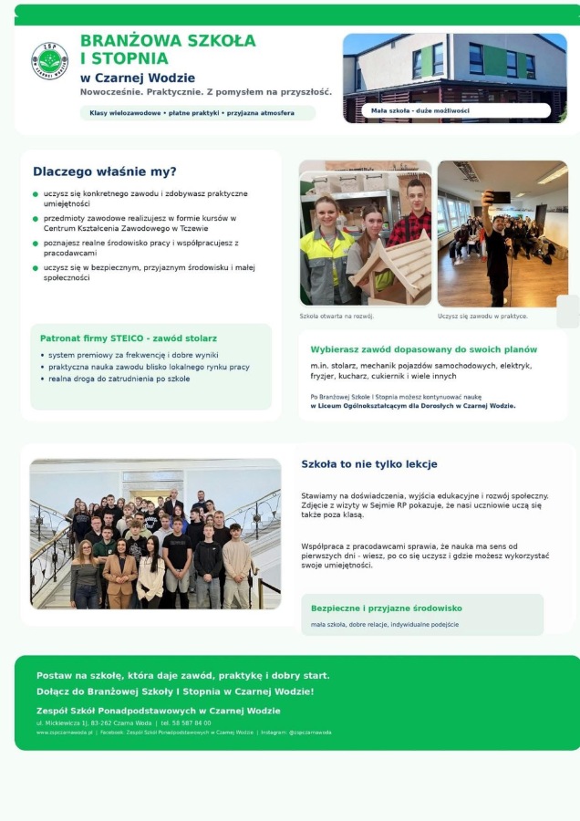 Zespół Szkół Ponadpodstawowych w Czarnej Wodzie miał przyjemność uczestniczyć 19 marca w Targach Edukacyjnych w Starogardzie Gdańskim podczas których zaprezentowaliśmy ofertę Branżowej Szkoły I stopnia. Był to czas wielu miłych spotkań, rozmów i okazja do przybliżenia młodzieży możliwości dalszego kształcenia.